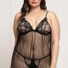 Two piece babydoll set. Lace and dot mesh babydoll with flyaway front, adjustable straps, satin ribbon bows, and g-string