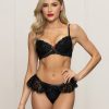 Two piece bra set. Embroidered lace bra with underwire, gold chain detail, hook and eye back, satin rosette, gold hardware, and skirted g-string