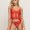 Two piece bustier set. Lace and heart mesh bustier with underwire, front hook and eye, satin ribbon bows, ruffle mesh trim, removable garters, and g-string