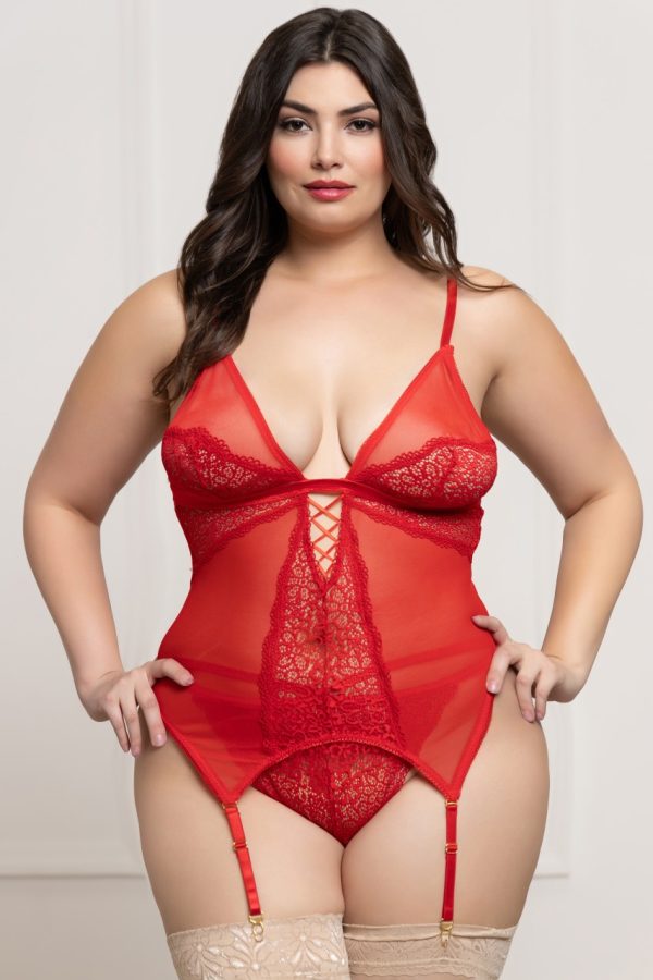 Two piece cami set. Lace and mesh cami with adjustable straps, gold hardware, removable garters, and strappy g-string