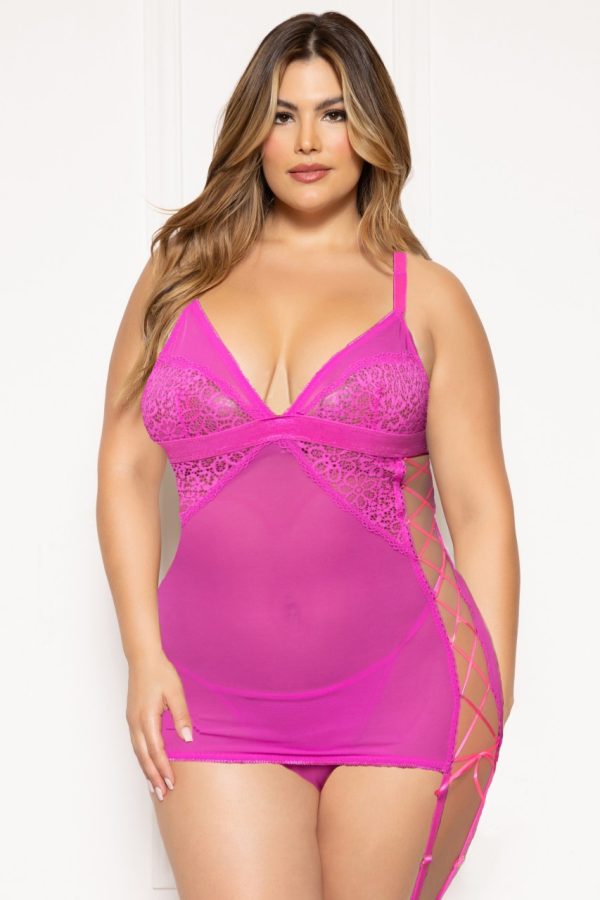 Two piece chemise set. Lace and mesh chemise with side ribbon lace-up, attached side garters, gold hardware, and g-string