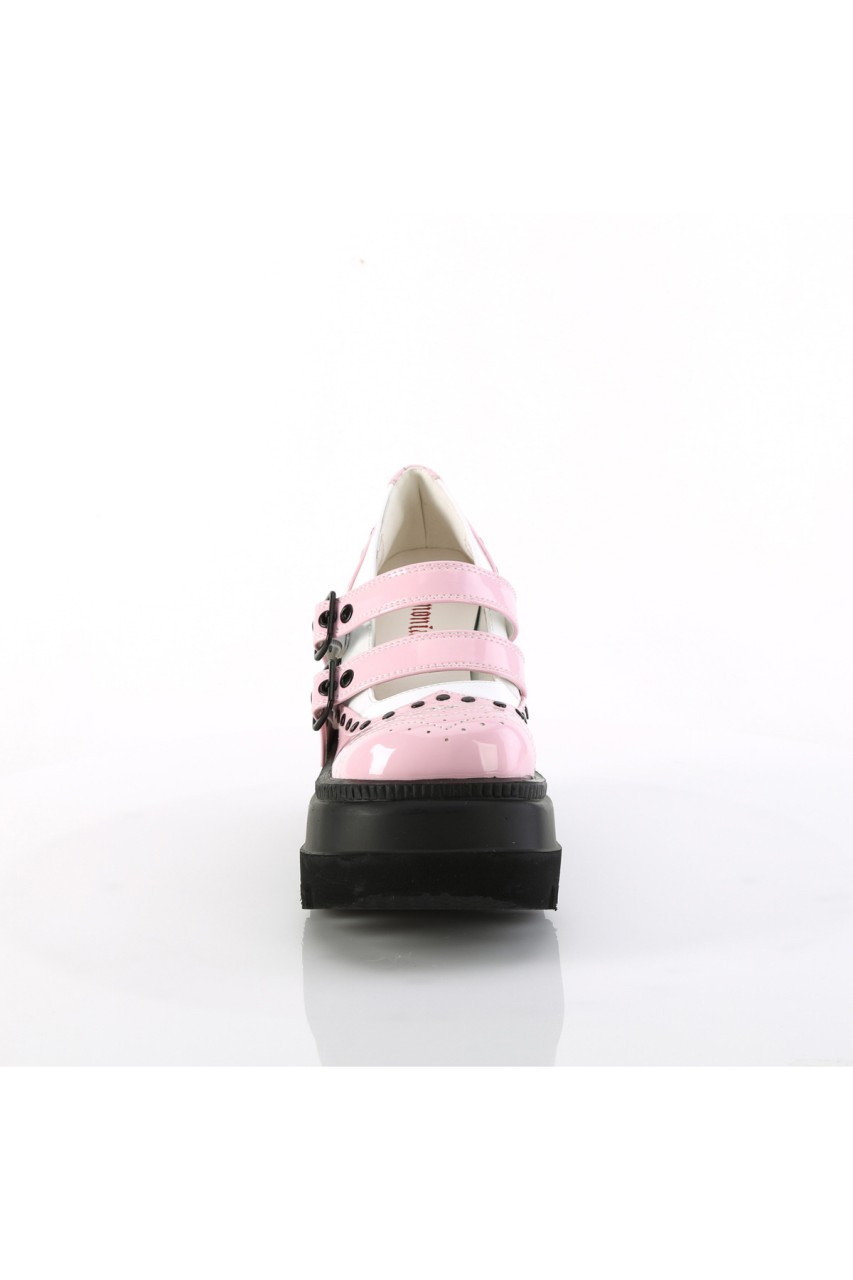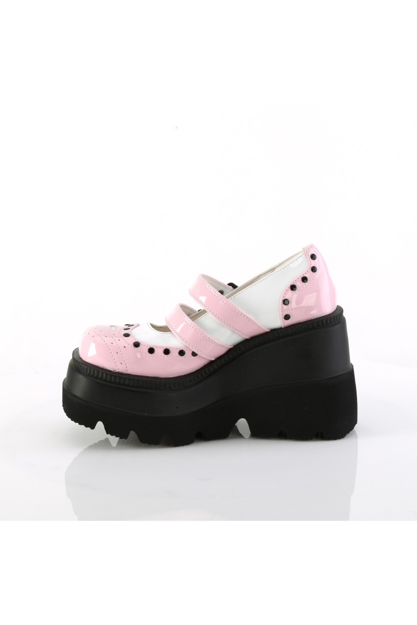 4 1/2″” (114mm) Wedge Platform Double Buckle Strap Wingtip Maryjane Featuring Silver-Tone Flat Round Studded Vamp and Heel