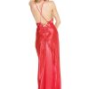 Stunning long gown with lace trimmed cups low back with criss cross tie shoulder straps that tie down to a flowing train of scalloped lace and charmeuse. Available in black electric blue red white. Also available in Plus Sizes. (Front image shown in black for illustrative purposes)