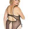 Stretch Lace and 15 Denier Open Bust Teddy With convenient crotch opening. Colors: Black Plum Red Hot Pink. Sizes: 1/2X 3/4X. Shown with No. 219 Gloves. XX2497 Size: 5/6X.