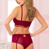 Two piece bra set. Velvet, floral galloon lace, and mesh long line bra with underwire lightly padded cups, satin ribbon tuxedo bows, keyhole details, cage detail, gold hardware, adjustable picot elastic straps, hook and eye closure, and high waist panty with removable garters
