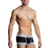 Mini short combines open weave mesh with soft nylon trim, support pouch, seamed back and embroidered satin logo labeled waistband.