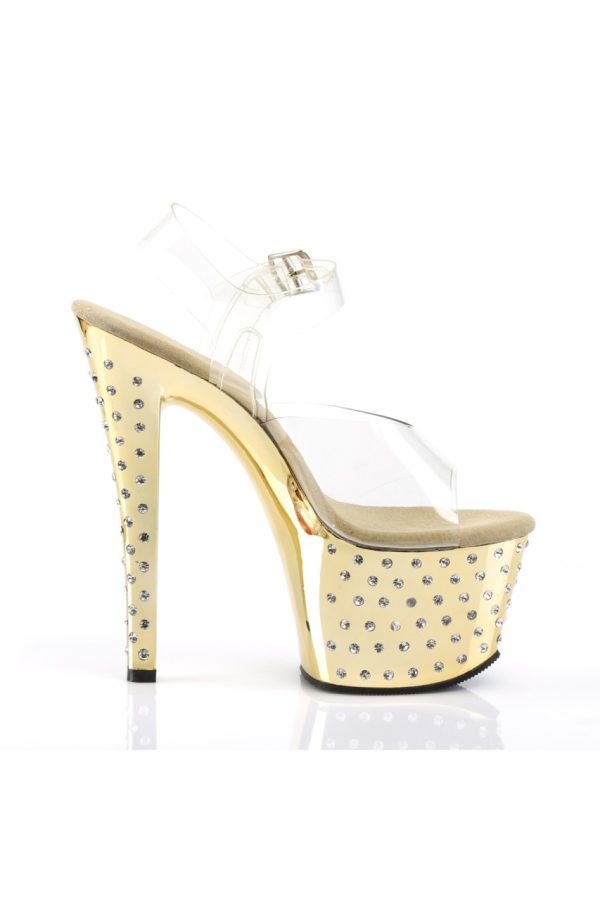 7″” (17.8cm) Heel, 2 3/4″” (7cm) Platform Ankle Strap Sandal Featuring Rhinestone Studded Chrome Bottom