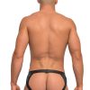 Jock accented with leather look front straps, leg bands and waistband with logo’d MP crest