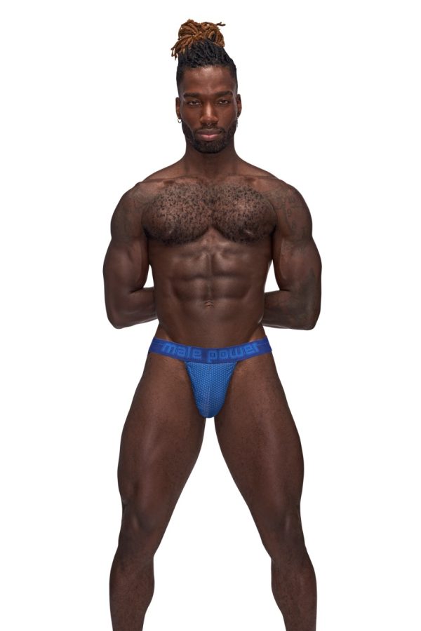 From the Sexagon collection by Male Power the Strappy ring jock with deluxe elastic back straps, including a yback thong strap, frames the exposed rear. Nickel plated rings and a plush branded printed waistband. Poly spandex hexagon print fabric with micro pin hole perforations for moisture wicking and cool breathability, plush branded elastic waistband. Hand wash separately, cold water, line dry, no bleach