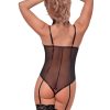 From the Dress Up collection by Magic Silk, this style includes: A sexy teddy with open bra cups and strap details, adjustable bra straps with metal sliders, open crotch cutout, attached adjustable garters with metal clips, and a matching collar and tie. Seductive black mesh with racy pinstripe detailing. Hand wash, cold. No Bleach. Dry flat.