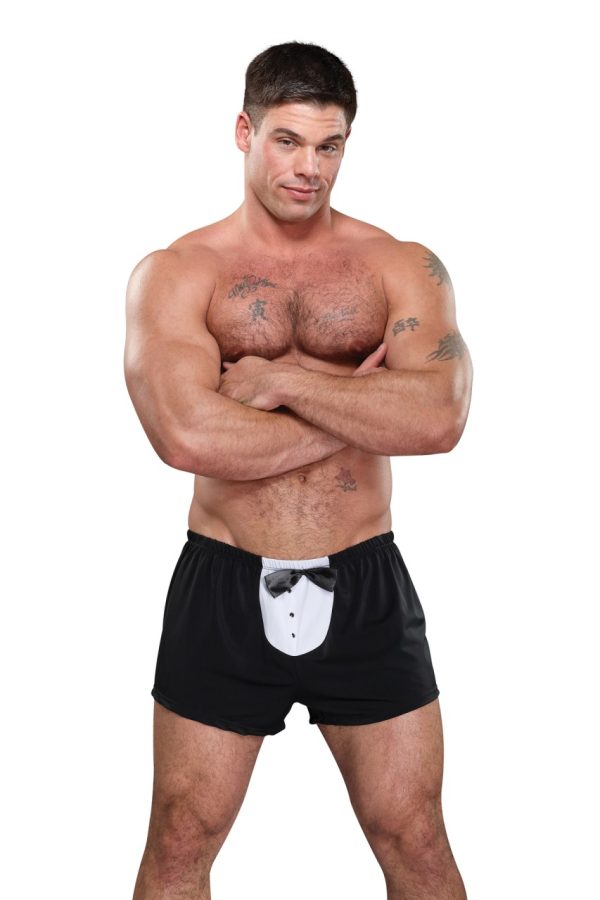 From the Novelty collection by Male Power, this style includes: A classic boxer featuring a tuxedo front with decorative faux buttons, satin bow accent, and plush elastic waistband. Stretchy polyester, spandex blend is cool and comfortable Hand wash separately, cold water, line dry. Do not bleach.