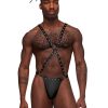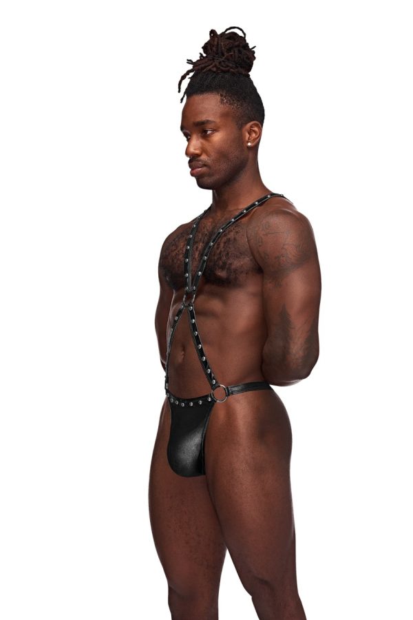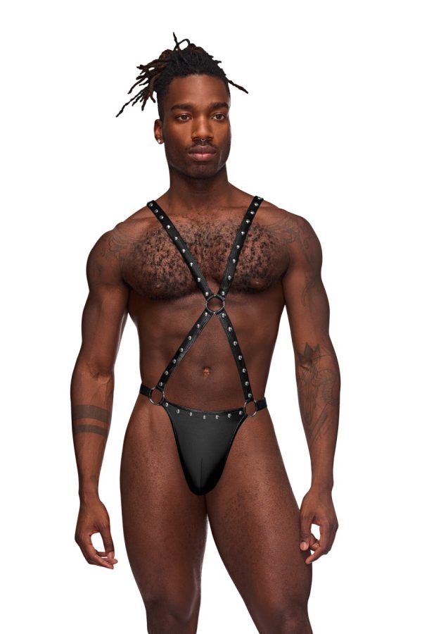 Warrior features one piece thong with contour pouch, decorative studs, cire waistband with rings, attached X style criss cross harness with center ring in front and Y style harness with ring connection affixed to the micro thong back.