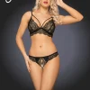 A two piece black bra set in beautiful lace. The top has adjustable shoulder straps and fastener at the back. The matching thong it crotch less. The item arrives packaged in a Yesx satin bag.
