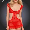 Beautiful open tie-front babydoll in red with gorgeous embroidered black lace covering the bust and sleeves. Matching thong included. This item arrives packed in a Provocative box.