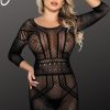 A little black bodystocking dress in all over design with sleeves and open back! Item arrives boxed. Please note thong is not included.