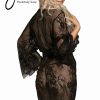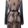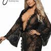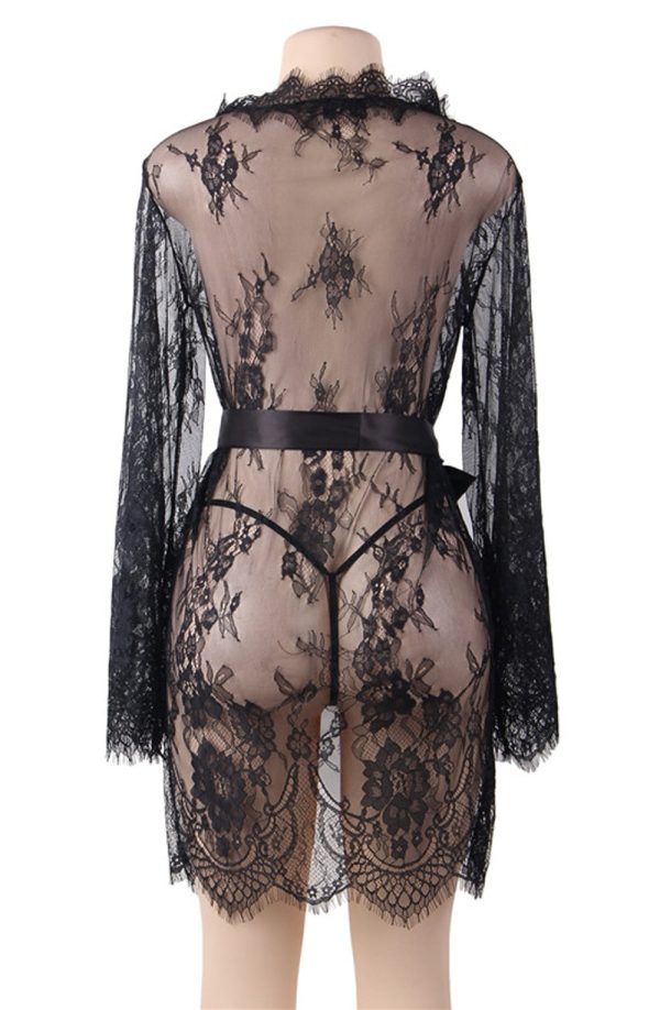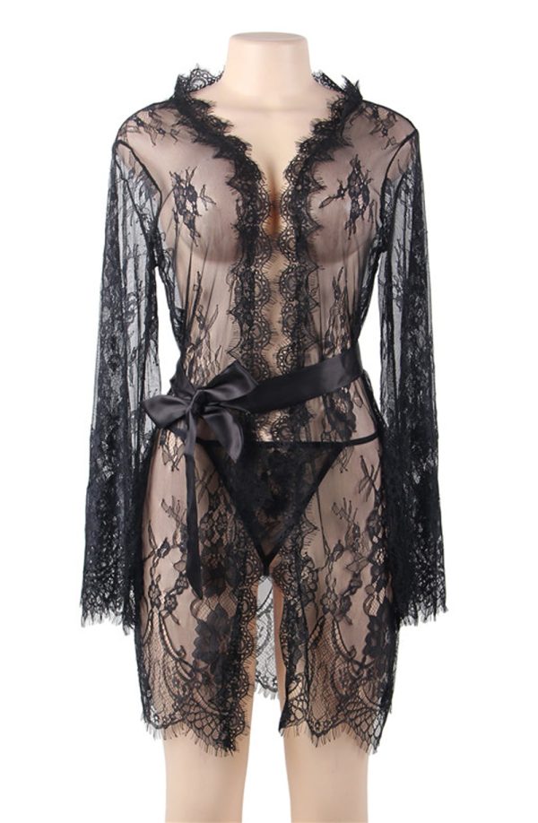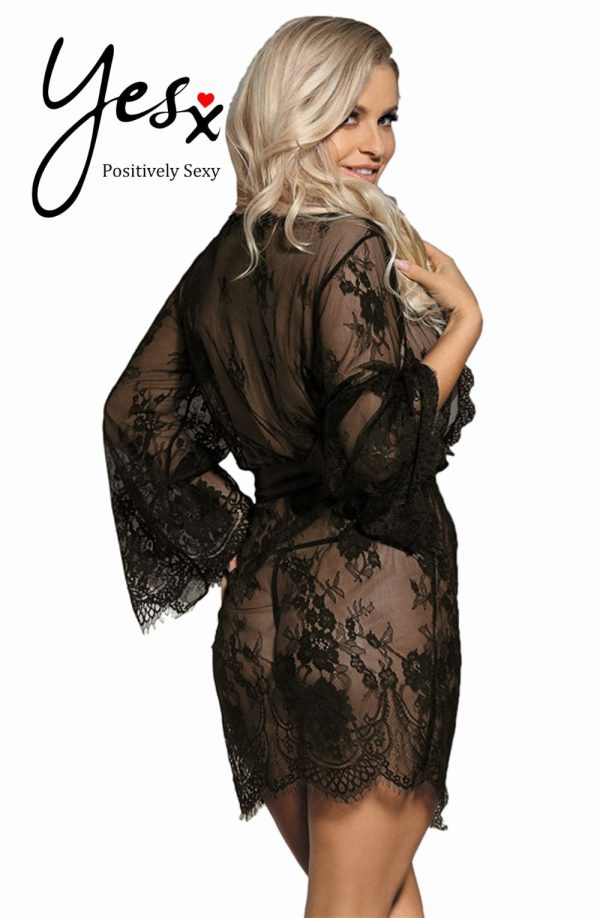 Beautiful dressing gown in transparent lacey fabric. Eyelash lace detail on the edges and satin ribbon tie. Matching thong is included. Item arrives packaged in a Yesx satin bag.
