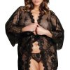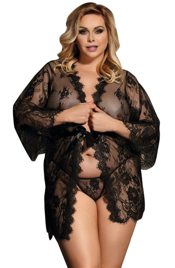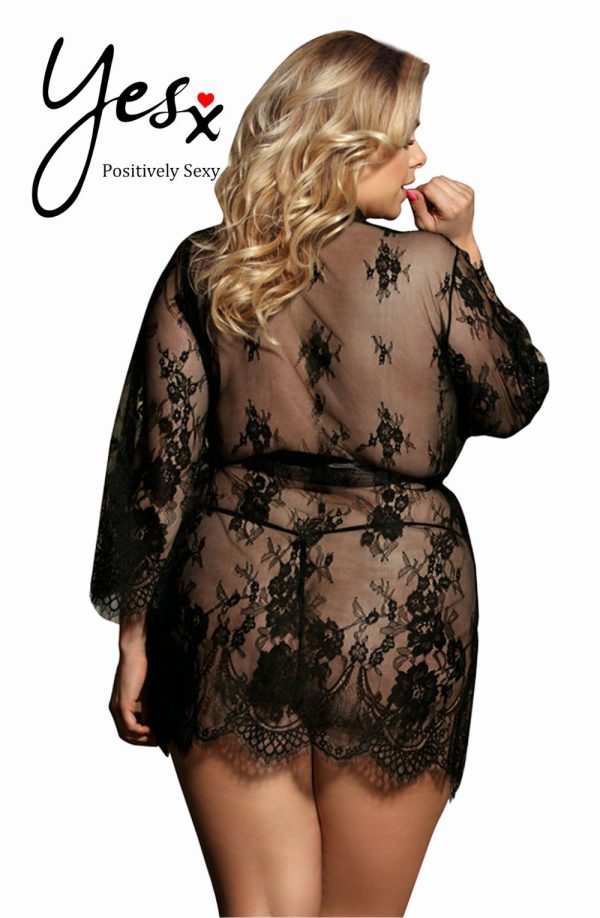 Beautiful dressing gown in transparent lacey fabric. Eyelash lace detail on the edges and satin ribbon tie. Matching thong is included. Item arrives packaged in a Yesx satin bag.