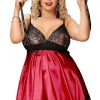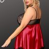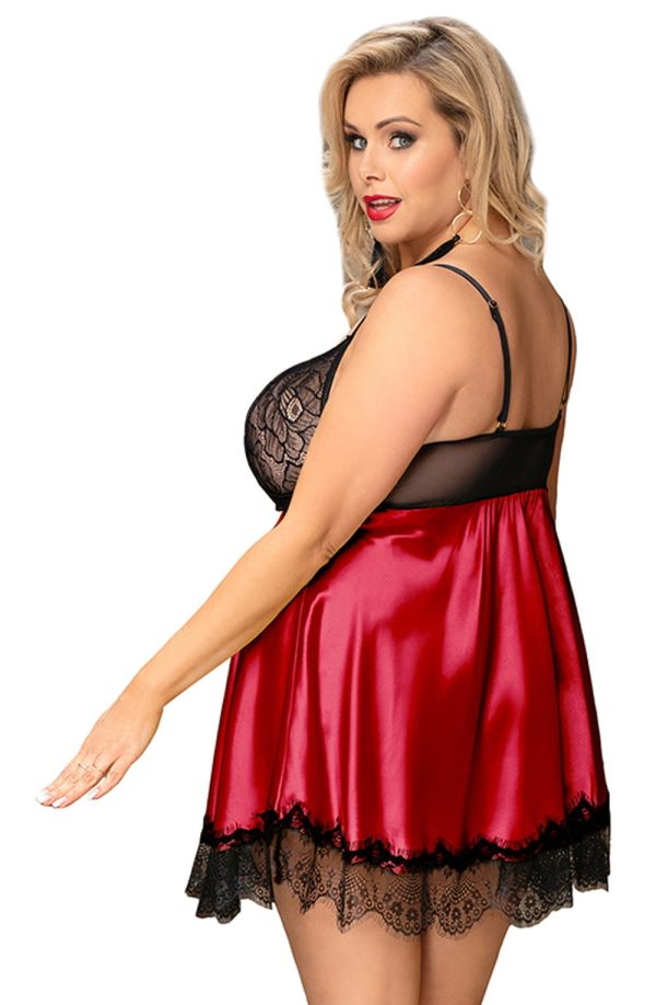 Beautiful flowing red satin babydoll with black lace cups. The straps are adjustable and the hem is edged with deep eyelash lace. Matching lace blindfold is included. This item arrives packaged in a Yesx satin bag.