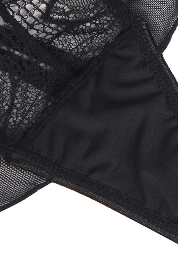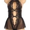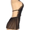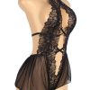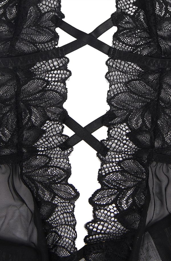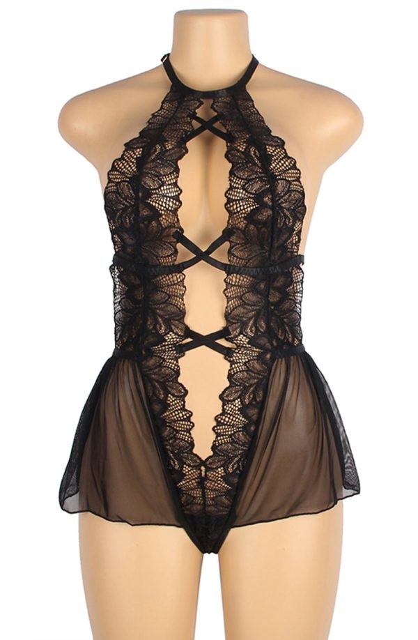 Beautiful open front deep v teddy in black tulle and stunning lace. Adjustable back straps and halter neck Arrives packaged in a Yesx satin bag.