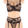 Beautiful lacey black three piece bras set. The bra, suspender belt and suspender straps are adjustable for comfort and fit. Item arrives packaged in a Yesx satin bag.