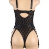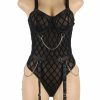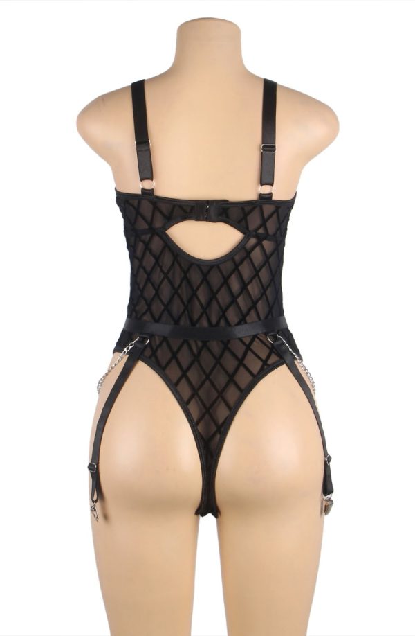 Celebrate your curves with confidence in our Plus Size Bodysuit, showcasing a captivating fabric design embellished with chains. The intricate pattern adds an alluring touch, while the chains bring an edgy flair. With adjustable garter straps, this bodysuit seamlessly combines sensuality and style, making it a perfect statement piece for any occasion. Embrace your confidence and make a striking statement with this unique plus-size patterned fabric bodysuit (stocking not included).