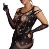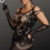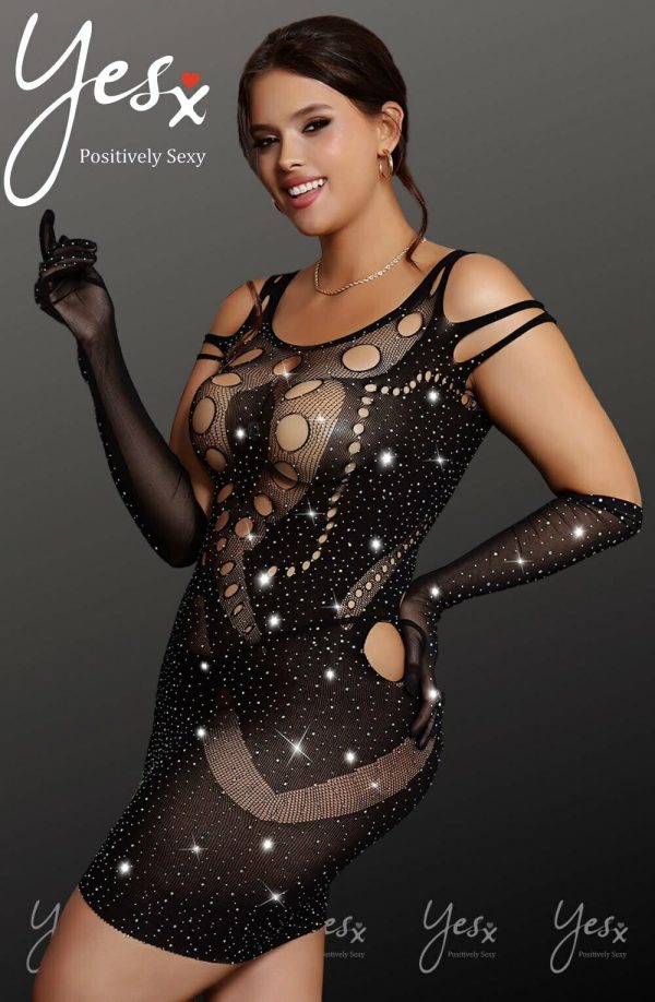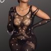 Celebrate your curves in style with this Black Plus Size Bodystocking Dress featuring shimmering detail. The chic design enhances and flatters your figure, while the intricate body stocking pattern adds a touch of allure. The shimmering detail brings a glamorous element, ensuring you stand out at any intimate occasion or night on the town. Embrace your confidence and showcase your sophistication with this stunning plus-size black bodystocking dress (gloves and thong are not included)