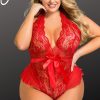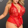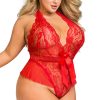 Meet this stunning hot red lacey teddy, the must-have lingerie for a confident women. Crafted from high-quality lace mesh, this breathable and lightweight design features an elegant ruffled hemline, creating a unique and sensual appearance for any occasion. The daring deep V-neckline and playful halter neck straps add sophistication, while the detachable waistband with a butterfly knot provides a trendy touch and flattering silhouette. Distinctive red lace deep V neckline feature Ruffle mesh & lace design to compliment your silhouette Detachable waist belt Packaged in a lovely YesX satin bag