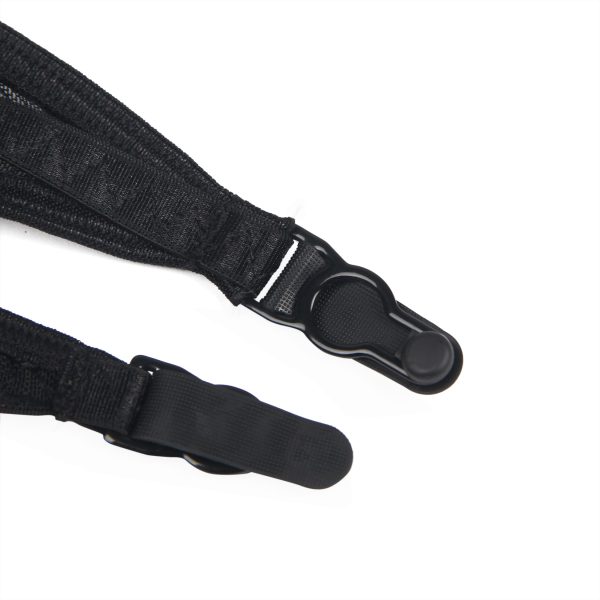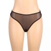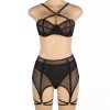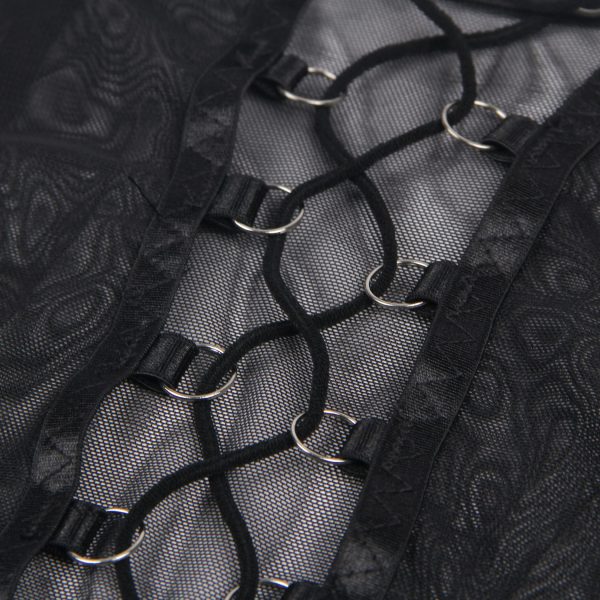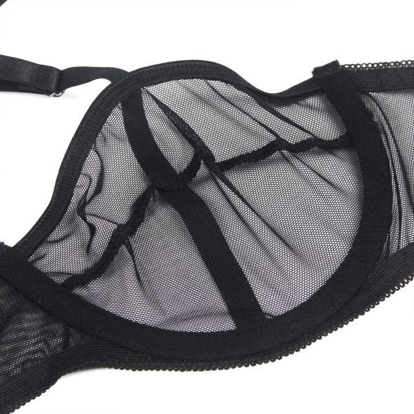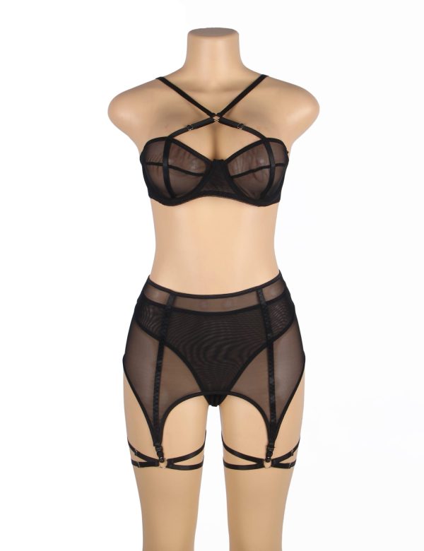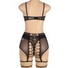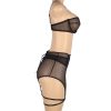 The black mesh bra features soft, breathable fabric providing a comfortable yet seductive fit. The matching garter belt is designed with a lace-up back for an adjustable, personalised fit, while the thong completes the look.