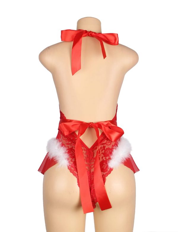 Bring some playful holiday magic to your wardrobe with this flirtatious plus-size Christmas lace teddy! Tied at the neck with a bold red ribbon, this halter-style piece offers the perfect mix of naughty and nice for every curve. The open back adds a daring touch, while a tie belt with fluffy white pom-poms and cosy trim along the sides makes it as festive as it is fun. Designed for holiday lounging or a cosy night in, this teddy will have you feeling merry, bright, and ready to sleigh!