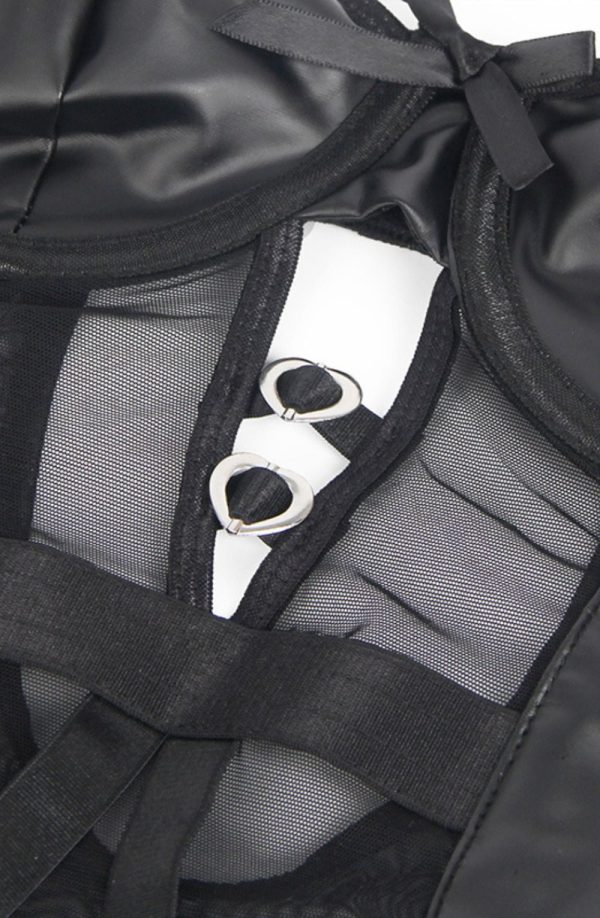 Black Faux Leather Look & Mesh Bodysuit with Garter Straps This striking black bodysuit combines bold faux leather panels with delicate sheer mesh for a daring yet sophisticated look. Featuring a structured underwire bust, side lace-up detailing, and adjustable shoulder straps for the perfect fit. This piece isn’t just lingerie; it’s an experience designed to make you feel absolutely captivating. The corset-inspired side lacing allows you to customize the fit to your body, accentuating your silhouette in all the right places. Whether worn for a special evening with someone special or simply as a celebration of your own sensuality, this bodysuit promises to make you feel like your most confident, empowered self. The elegant design includes: Premium faux leather material with a high-shine finish Strategic mesh panels creating visual interest and texture contrast Corset-inspired side lacing for an adjustable fit and edgy aesthetic Detachable garter straps for versatile styling options Hook-and-eye back closure for easy wear