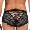 Seductive black sheer floral lace men’s boxer brief with satin like finish waist band. Featuring decorative criss-cross tie detailing at the back of the briefs.