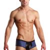 Zipper short with low cut waist and high cut leg features contrasting black trim and zippered pouch.