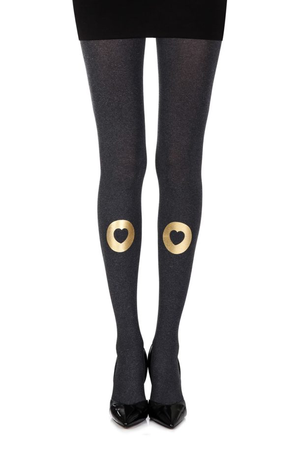 Opaque gray melange 120 denier tights with gold print in the shape of a circle and inside there is a shape of a heart in the same color of the tights. The print is on both legs and can be worn either at the front or at the back part of the legs.