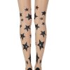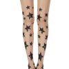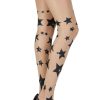 Sheer skin color 20 denier tights with black stars with different sizes print. The print is on both legs front and back.