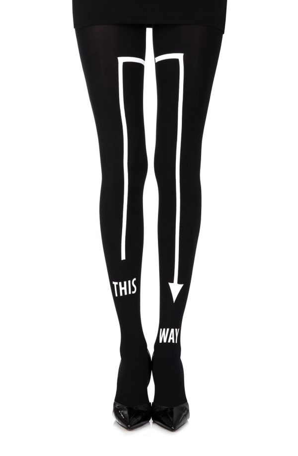 Opaque black 120 denier tights with arrow motif and ‘This’ ‘Way’ on each leg. The print is on both legs and can be worn either at the front or at the back part of the legs.