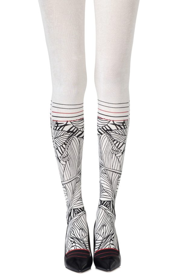 Mai Tais for two! Strum your ukelele with Waikiki Nights sock-style tights that mix a palm leaf illustration and stripes. Colour: Cream tights with Black Red print. Thickness: 100 denier. Made from Cotton. Unless they have X-ray vision no one will be able to see through these opaque tights. Get athletic with our two-sided knee-high sock-style print. Hand print no two are the same.